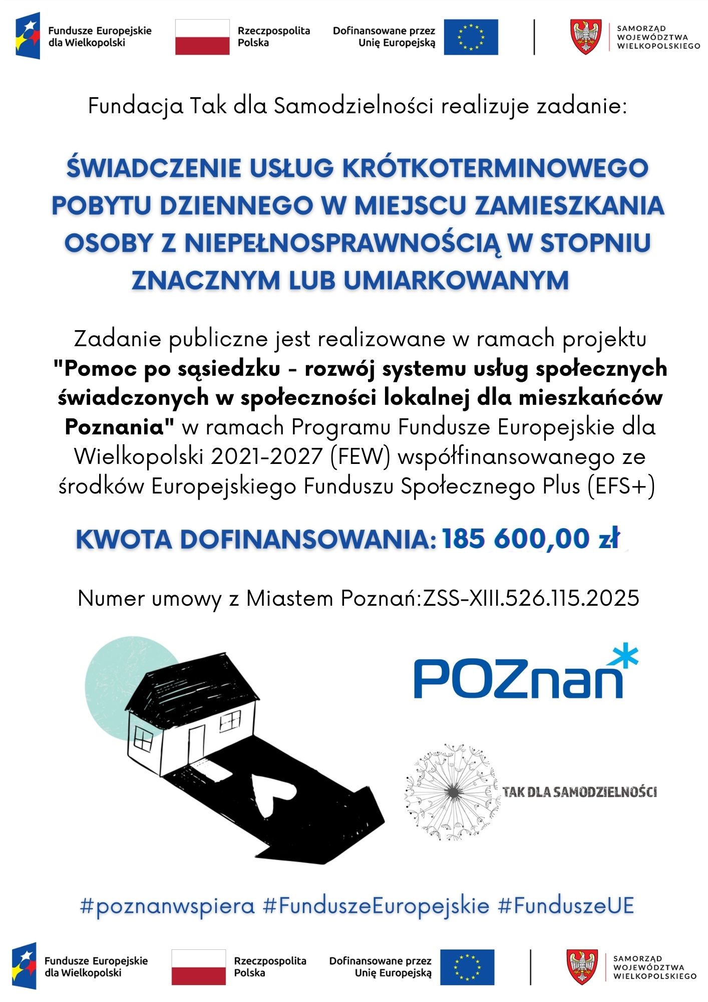 Projekt jest częścią inicjatywy „Pomoc po sąsiedzku – rozwój systemu usług społecznych świadczonych w społeczności lokalnej dla mieszkańców Poznania” w ramach Programu Fundusze Europejskie dla Wielkopolski 2021-2027 (FEW). Przedsięwzięcie współfinansowane jest ze środków Europejskiego Funduszu Społecznego Plus (EFS+).